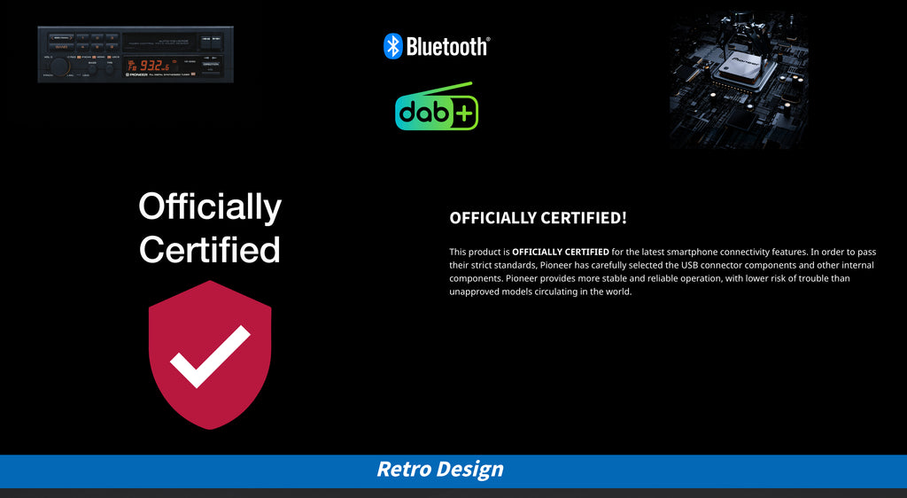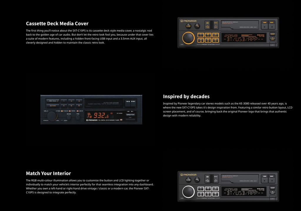 The Pioneer SXT-C10PS is a 1-DIN retro Car Audio receiver that is going modernise your classic car. Designed to blend in, yet stand out, it is a perfect blend of retro aesthetics and cutting-edge automotive audio technology.